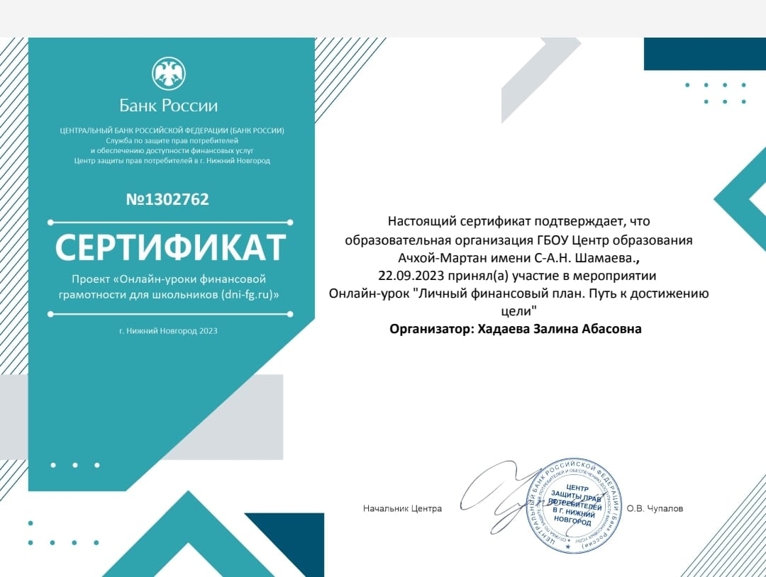 22 сентября приняли участие в мероприятии "Личный финансовый план. Путь к достижению цели". Организатор мероприятия: Хадаева З.А.