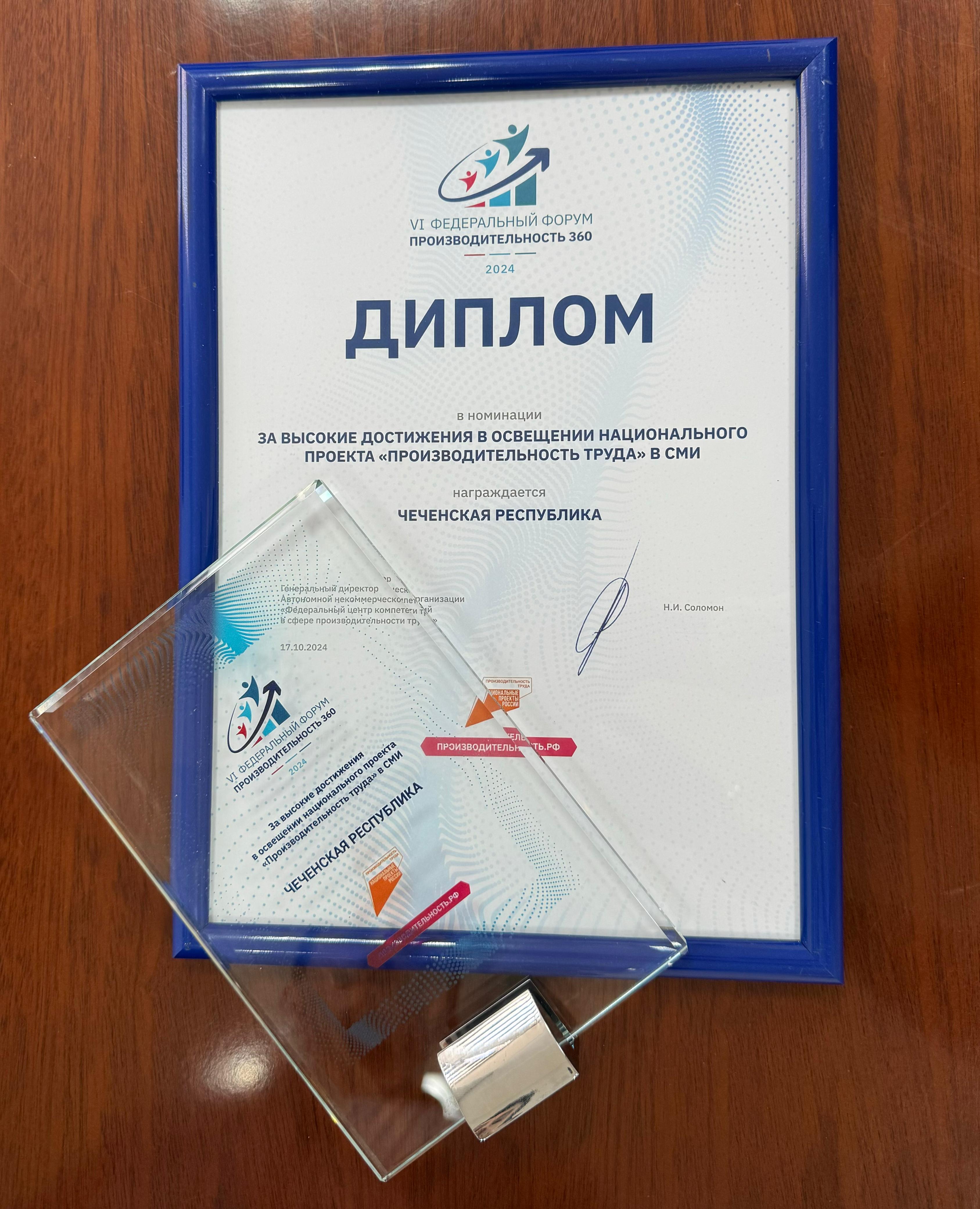 Чеченская Республика награждена дипломом в номинации «За высокие достижения в освещении национального проекта «Производительность труда» в СМИ».